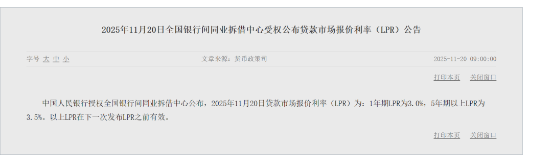 今天,中国人民银行授权全国银行间同业拆借中心公布11月最新的LPR:1年期LPR为3.0%,五年期以上LPR为3.5%。
